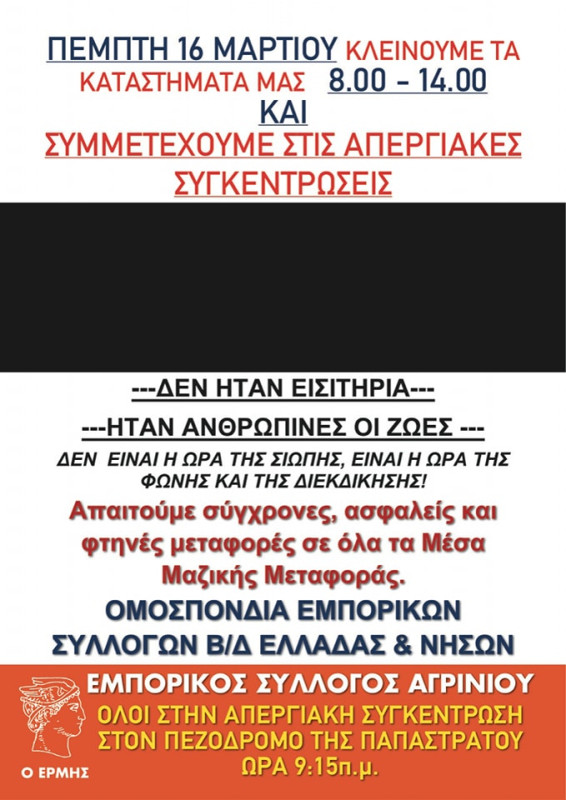 Το Δ.Σ. του Ε.Σ.Α. ενημέρωσε προ ημερών τα μέλη και τους καταναλωτές το πρωί (08:00 έως 14:00) της Πέμπτης 16/03/2023 τα εμπορικά καταστήματα της πόλης μας θα παραμείνουν κλειστά καθώς συμμετέχουν στις απεργιακές κινητοποιήσεις κατόπιν και της απόφασης της Γενικής Συνέλευσης της Ομοσπονδίας.