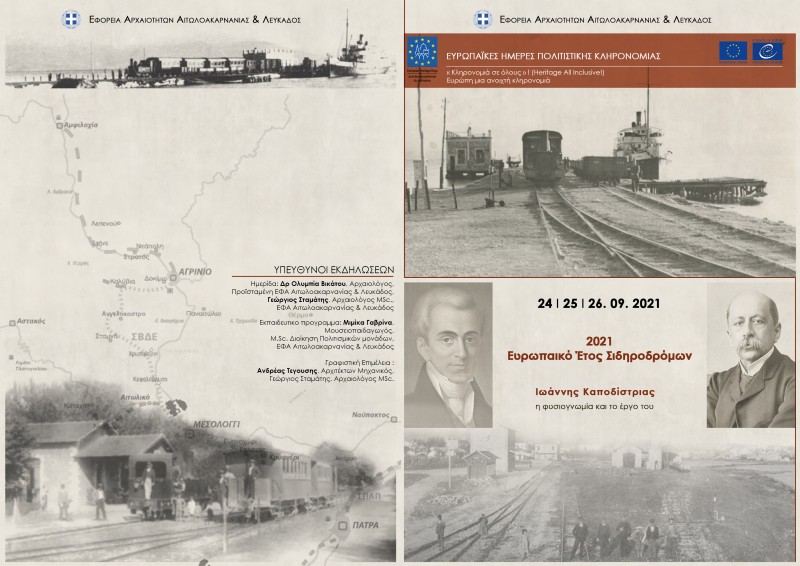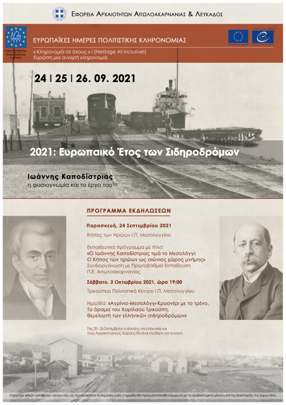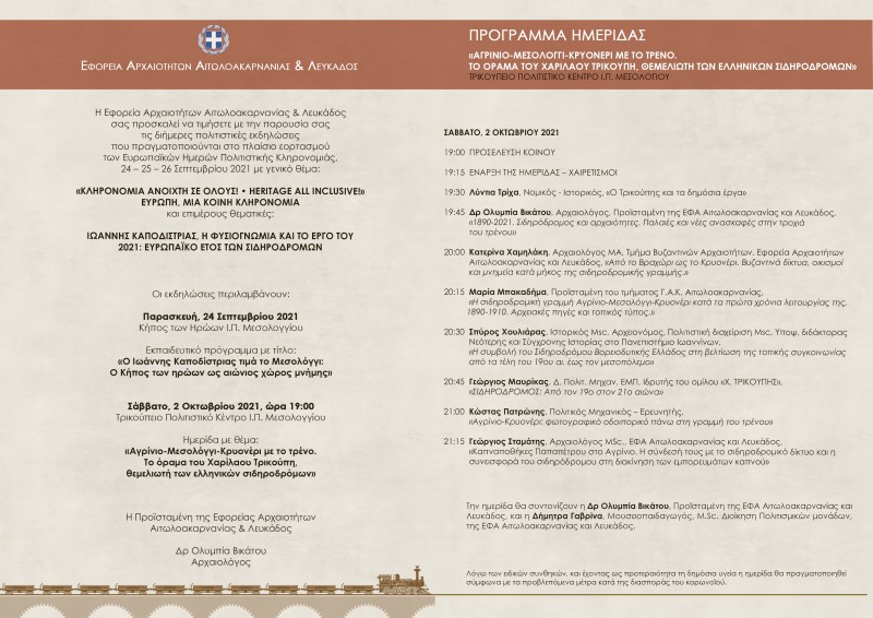 Εορτασμός για τις Ευρωπαϊκές Ημέρες Πολιτιστικής Κληρονομιάς συνεχίζεται το Σάββατο, 2 Οκτωβρίου 2021 στις 19:00 στο Τρικούπειο Πολιτιστικό Κέντρο Ι.Π. Μεσολογγίου με την πραγματοποίηση της Ημερίδας που έχει ως θέμα: «Αγρίνιο-Μεσολόγγι-Κρυονέρι με τρένο», το όραμα του Χαρίλαου Τρικούπη θεμελιωτή των ελληνικών σιδηροδρόμων».