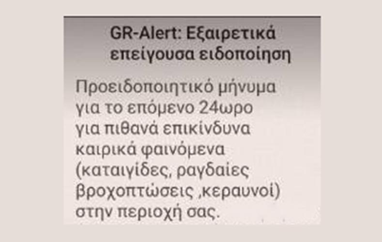 Το μήνυμα αναφέρει: «Προειδοποιητικό μήνυμα για το επόμενο 24ωρο για πιθανά επικίνδυνα καιρικά φαινόμενα (καταιγίδες, ραγδαίες βροχοπτώσεις, κεραυνοί) στην περιοχή σας.