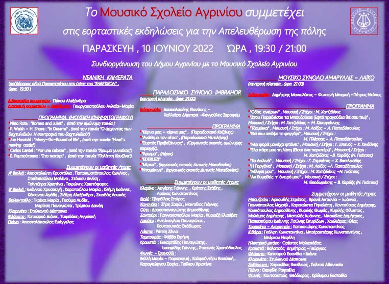 Ο Δήμος Αγρινίου σε συνεργασία με το Μουσικό Σχολείο, διοργανώνουν εορταστικές εκδηλώσεις για την επέτειο της απελευθέρωσηςτης πόλης, την Παρασκευή 10 Ιουνίου στις 19:30 στον πεζόδρομο της Παπαστράτου και στις 21:00 στην πλατεία Δημοκρατίας.