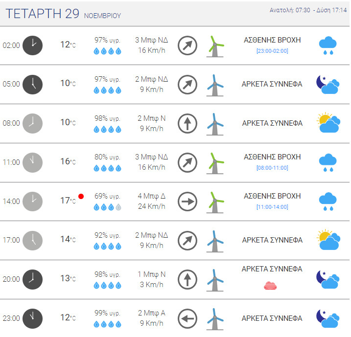 Για την Τετάρτη, 29 Νοεμβρίου 2023 προβλέπονται νεφώσεις με βροχές και τοπικές καταιγίδες στα Επτάνησα, στην Ήπειρο, τη Δυτική και Στερεά Ελλάδα, την Πελ/νησο, τις Κυκλάδες, στα νησιά του Ανατολικού Αιγαίου και τη Θράκη.