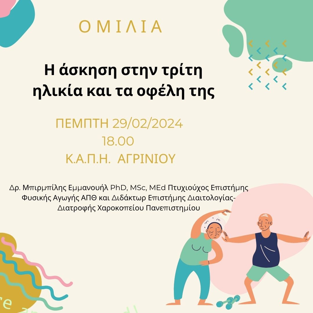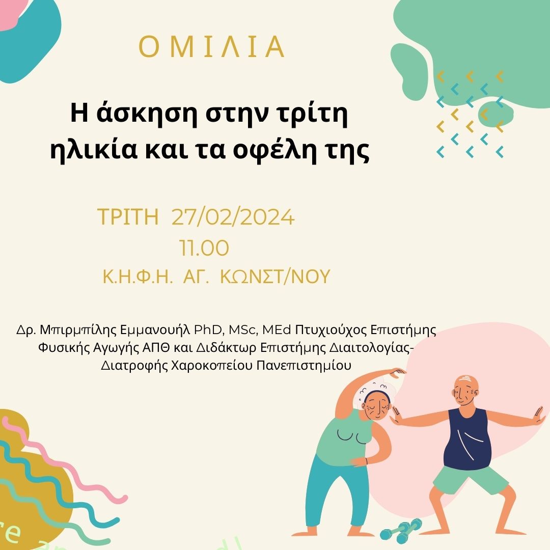 Δύο ομιλίες με θέμα: «Η Άσκηση στην Τρίτη Ηλικία και τα Οφέλη της» θα πραγματοποιήσει ο Δρ. Εμ. Μπιρμπίλης PhD, MSc, MEd Πτυχιούχο Επιστήμης Φυσικής Αγωγής Α.Π.Θ. και Διδάκτωρ Επιστήμης Διαιτολογίας – Διατροφής Χαροκόπειου Πανεπιστημίου.