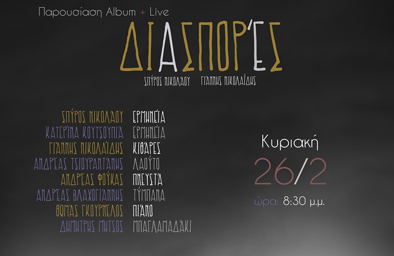 Την Κυριακή 26 Φεβρουαρίου στις 8.30 το βράδυ, η μουσική σκηνή «Ανδρομέδα» και οι Αγρινιώτες τραγουδοποιοί Σπύρος Νικολάου και Γιάννης Νικολαΐδης παρουσιάζουν τον ολοκαίνουργιο δίσκο με τίτλο «ΔΙΑΣΠΟΡΕΣ» που κυκλοφορεί ψηφιακά τον Φεβρουάριο απο την Formiggart, αλλά και σε CD.