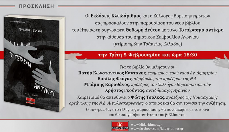Την Τρίτη 5 Φεβρουαρίου στις 6.30 μ.μ. στην Αίθουσα του Δημοτικού Συμβουλίου στο Αγρίνιο, παρουσιάζουμε το νέο βιβλίο του Ηπειρώτη συγγραφέα Θοδωρή Δεύτου: «Το πέρασμα αντίκρυ».