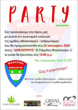 Αγρίνιο – Party Φ.Ο.Ε.Α.Π.Π.Α.: Πάρτι ενίσχυσης της ομάδας εθελοντισμού – ανθρωπισμού θα πραγματοποιηθεί την Παρασκευή, 24 Ιανουαρίου 2020 στους Διόσκουρους (Α’ Πάροδος Μεσολογγίου 1) το οποίο θα ξεκινήσει στις 10:00 μ.μ.