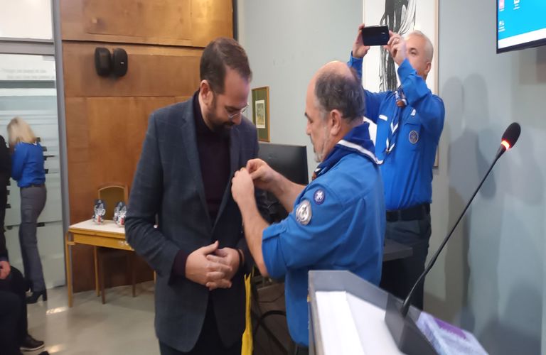 Ο κ. Φαρμάκης τιμήθηκε από εμάς με το μετάλλιο «φίλου του προσκοπισμού» για την ιδιαίτερη συμβολή του στην διοργάνωση που πραγματοποίησαν οι πρόσκοποι του Αγρινίου τον Απρίλιο του 2022, την Πανελλήνια Ανιχνευτική Πολιτιστική Ενημέρωση (Π.Α.Π.Ε.) .