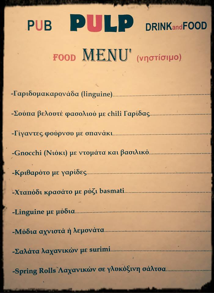 Το PULP ή ορθότερα η PULP (PUB PULP DRINKandFOOD) είναι μια όσο το δυνατόν καθαρόαιμη PUB=pubblic, δηλαδή ένας δημόσιος χώρος, που τα πρώτα ίχνη της τα συναντάμε στην Αγγλία αμέσως μετά την πτώση της Ρωμαϊκής αυτοκρατορίας, και όπου προσφέρονται Μπίρες, Αλκοολούχα ποτά, Φαγητό και Αναψυκτικά.