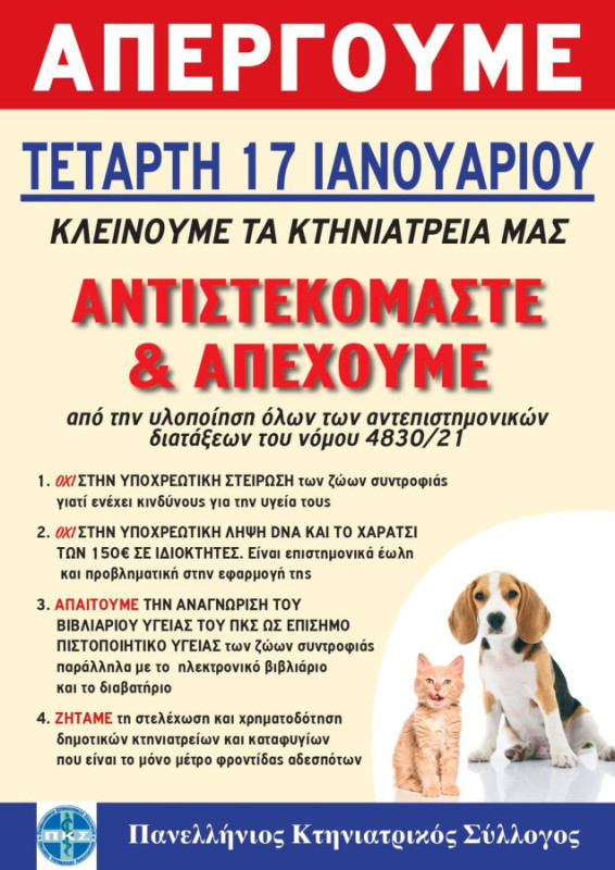 Οι Kτηνίατροι προκήρυξαν για σήμερα Τετάρτη πανελλαδική απεργία και γι’ αυτό όλα τα κτηνιατρεία της περιοχής, αλλά και πανελλαδικά, θα είναι κλειστά. Ο λόγος της 24ωρης απεργίας είναι η εφαρμογή του νόμου 4830, ο οποίος μπορεί να έχει ψηφιστεί εδώ και 2 χρόνια, αλλά σταδιακά αρχίζει να εφαρμόζεται τώρα.