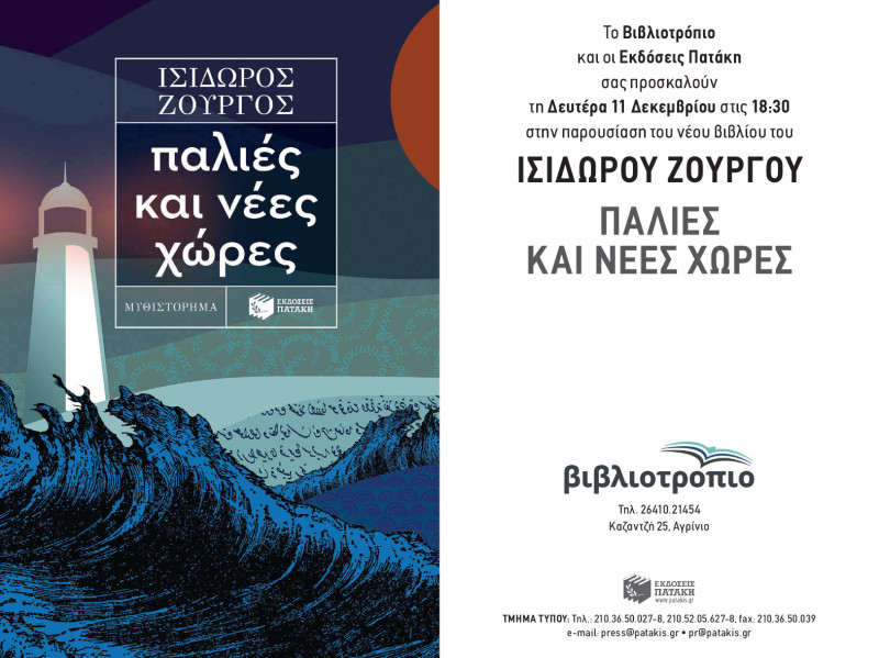 Τo Βιβλιοπωλείο «Βιβλιοτρόπιο» και οι Εκδόσεις «Πατάκη» σας προσκαλούν τη Δευτέρα, 11 Δεκεμβρίου στις 18:30 το απόγευμα στην παρουσίαση του νέου βιβλίου του Ισίδωρου Ζουργού «Παλιές και νέες χώρες» στο Αγρίνιο.