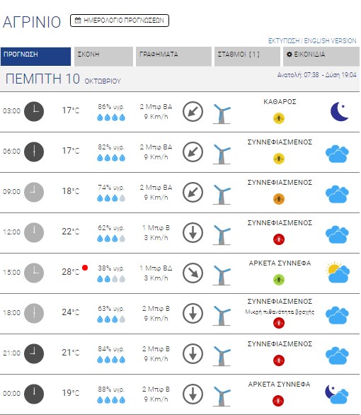 Την Πέμπτη 10 Οκτωβρίου 2019 αναμένονται τοπικές νεφώσεις κατά περιόδους με σποραδικές βροχές στο Ιόνιο και τα Δυτικά και Νότια ηπειρωτικά από το μεσημέρι.