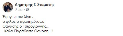 Χαρακτηριστικό είναι το αποχαιρετιστήριο μήνυμα του πρώην Νομάρχη Αιτωλοακαρνανίας κ. Δημήτρη Σταμάτη για την συγκεκριμένη απώλεια του Θανάση Τσιρογιάννη
