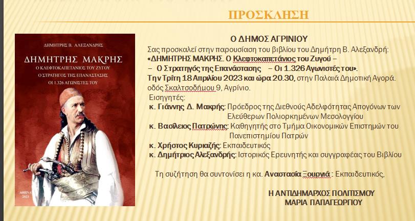 Ο Δήμος Αγρινίου διοργανώνει την παρουσίαση του βιβλίου του Δημήτρη Β. Αλεξανδρή: «Δημήτρης Μακρής: Ο Κλεφτοκαπετάνιος του Ζυγού – Ο Στρατηγός της Επανάστασης – Οι 1.326 Αγωνιστές του», την Τρίτη, 18 Απριλίου 2013 και ώρα 20:30, στην Παλαιά Δημοτική Αγορά (Σκαλτσοδήμου 9, Αγρίνιο).