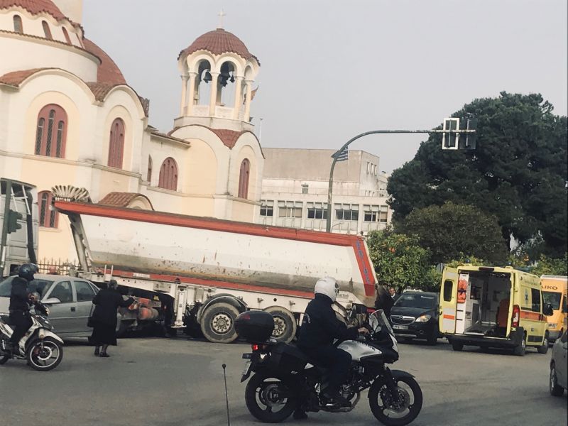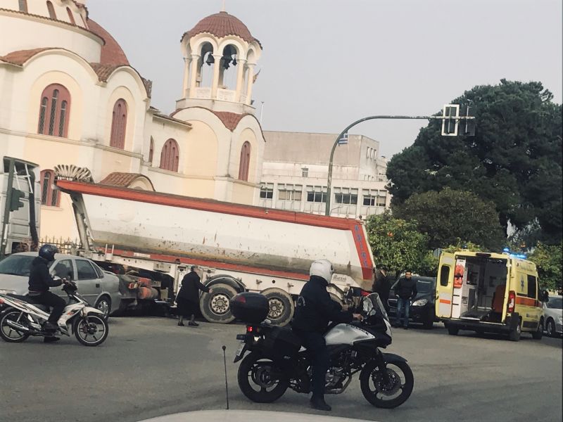 Πιο συγκεκριμένα οδηγός νταλίκας που επιχείρησε ελιγμό σε παράδρομο του ναού του Αγίου Δημητρίου παρέσυρε οδηγό δικύκλου και τον τραυμάτισε στα πόδια.