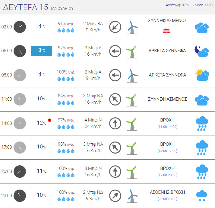 Για τη Δευτέρα, 15 Ιανουαρίου 2024 προβλέπονται βροχές αρχικά στα δυτικά, στις Κυκλάδες, στην Κρήτη και στα Δωδεκάνησα, οι οποίες βαθμιαία θα επεκταθούν ανατολικότερα και θα επηρεάσουν το μεγαλύτερο τμήμα της χώρας. Τοπικές καταιγίδες θα εκδηλωθούν στη Νότια Πελοπόνησσο και αργά το βράδυ στα νησιά του Ανατολικού Αιγαίου. Τοπικά περιορισμένη ορατότητα και παγετός τις βραδινές και πρώτες πρωινές ώρες στα κεντρικά και βόρεια ηπειρωτικά.