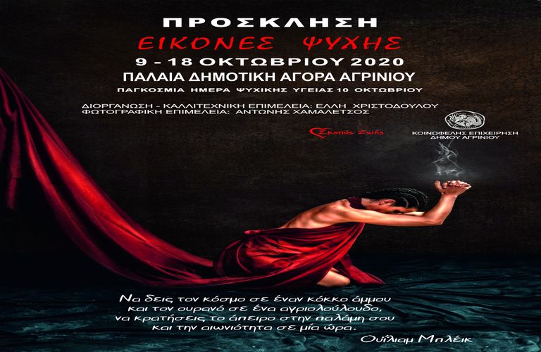 Με αφορμή την Παγκόσμια Ημέρα Ψυχικής Υγείας στις 9 Οκτωβρίου, θα πραγματοποιηθεί η εκδήλωση “Εικόνες Ψυχής” από τους εθελοντές του φιλανθρωπικού οργανισμού “Σκοπός Ζωής”, Έλλη Χριστοδούλου και Αντώνη Χαμαλέτσο, από 9-18 Οκτωβρίου στην Παλαιά Δημοτική Αγορά Αγρινίου, Υπό την αιγίδα της Κοινωφελούς Επιχείρησης του Δήμου Αγρινίου.