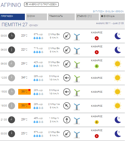 Την Πέμπτη 27 Ιουνίου 2019 αναμένεται ηλιοφάνεια με τοπικές μόνο νεφώσεις, κυρίως στα ορεινά ηπειρωτικά και τα ορεινά της Κρήτης, όπου θα σημειωθούν πρόσκαιρες βροχές ή όμβροι τόσο κατά τις πρώτες ώρες του εικοσιτετραώρου όσο και το μεσημέρι και απόγευμα.