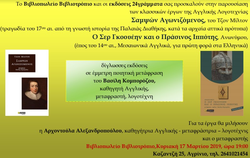 Σαμψών Αγωνιζόμενος (Samson Agonistes) του Τζον Μίλτον, μτφρ.: Βασίλης Κομπορόζος, καθηγητής Αγγλικών – μεταφραστής