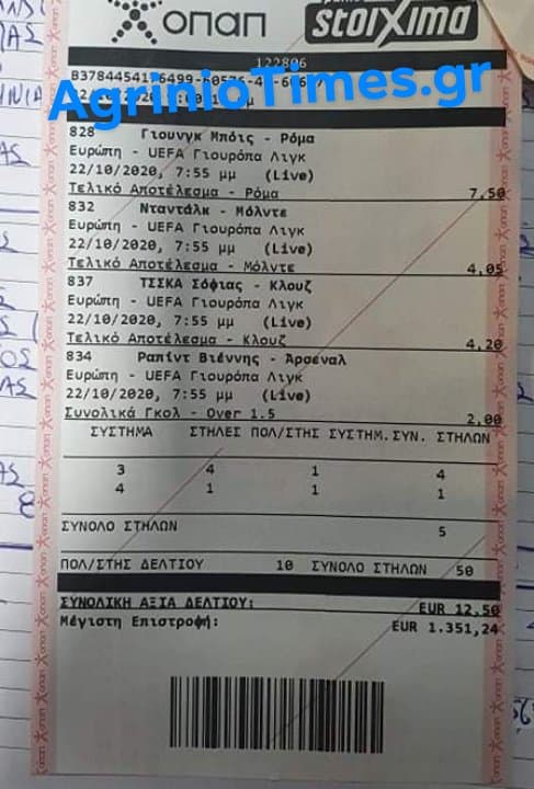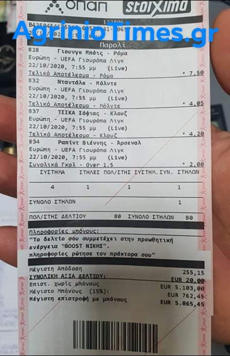 Πέμπτη βράδυ σε γνωστό πρακτορείο στο κέντρο της πόλης του Αγρινίου ένας τακτικός πελάτης έπαιξε δυο δελτία στοιχήματος στο ένα με 12 ευρώ κέρδισε 1.351,24 ευρώ και στο άλλο δελτίο που είχε ακριβώς τους ίδιους αγώνες το έπαιξε με 20 ευρώ και κέρδισε 5.103 ευρώ που με το μπόνους του 15% έφτασε στα 5.865,45 ευρώ έχοντας παίξει κατά την διάρκεια του live τη νίκη της Ρόμα επί της Γιούνγκ Μπόις με 7,5 απόδοση, τη νίκη της Μόλντε επί της Νταντάλκ με 4,05 απόδοση, τη νίκη της Κλουζ επί της ΤΣΣΚΑ Σόφιας με 4,20 απόδοση και το Over1.5 στο Ραπίντ Βιέννης – Άρσεναλ με 2 απόδοση.