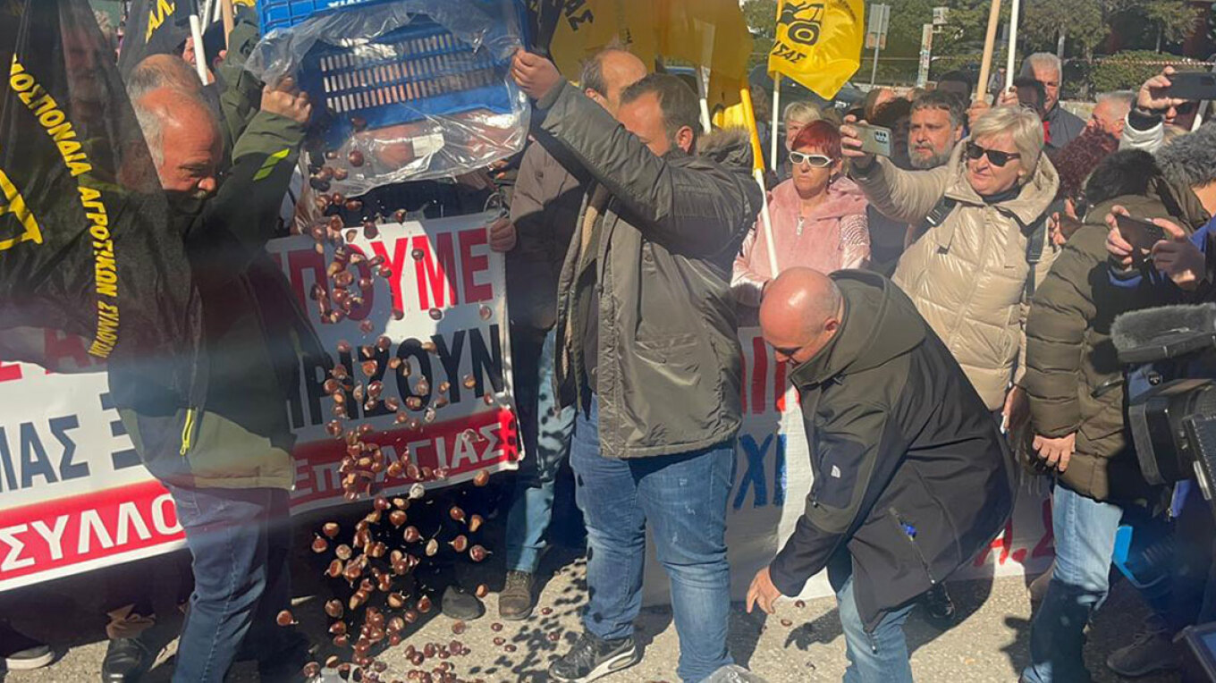 Οι αγρότες αδειασαν τελάρα με κάστανα και μήλα έξω από τη ΔΕΘ, στο πλαίσιο της διαμαρτυρίας τους.