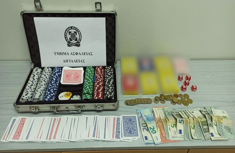 Κατασχέθηκαν τράπουλες, μεταλλική βαλίτσα με μάρκες και ζάρια, καθώς και χρηματικό ποσό