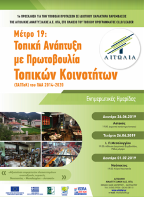 Η ΑΙΤΩΛΙΚΗ ΑΝΑΠΤΥΞΙΑΚΗ Α.Ε. Ο.Τ.Α. στο πλαίσιο υλοποίησης του Τοπικού της Προγράμματος «Τοπική Ανάπτυξη με Πρωτοβουλία Τοπικών Κοινοτήτων (ΤΑΠΤοΚ) CLLD/LEADER» Μέτρο 19 του ΠΑΑ 2014 – 2020, διοργανώνει ημερίδα με θέμα «1η Πρόσκληση για την υποβολή προτάσεων για ιδιωτικού χαρακτήρα παρεμβάσεις».
