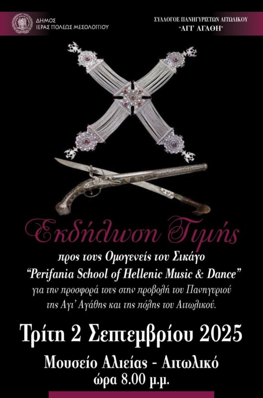 Ο Δήμος Ιεράς Πόλεως Μεσολογγίου και ο Σύλλογος Πανηγυριστών Αιτωλικού «Αγία Αγάθη», διοργανώνουν εκδήλωση τιμής προς τους Ομογενείς του Σικάγο και τη Σχολή «Perifania School of Hellenic Music & Dance» για την πολύτιμη προσφορά τους στην προβολή του ιστορικού Πανηγυριού της Αγίας Αγάθης και της πόλης του Αιτωλικού.