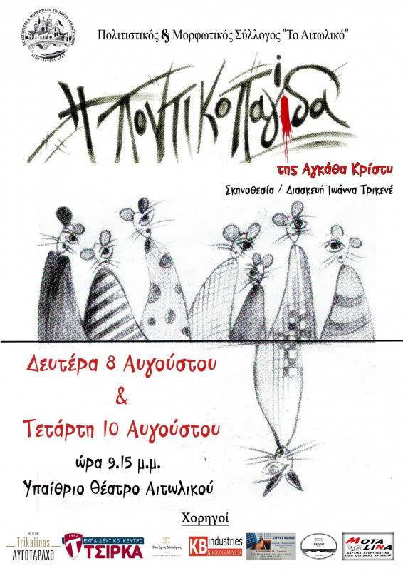 Με την παράσταση «Η Ποντικοπαγίδα», από την Θεατρική Ομάδα Αιτωλικού, ολοκληρώνεται το 9ο Φεστιβάλ «Θεάτρου Όψεις», τη Δευτέρα, 8 Αυγούστου και ώρα 9:15 μ.μ., στο Υπάιθριο Θέατρο Αιτωλικού.