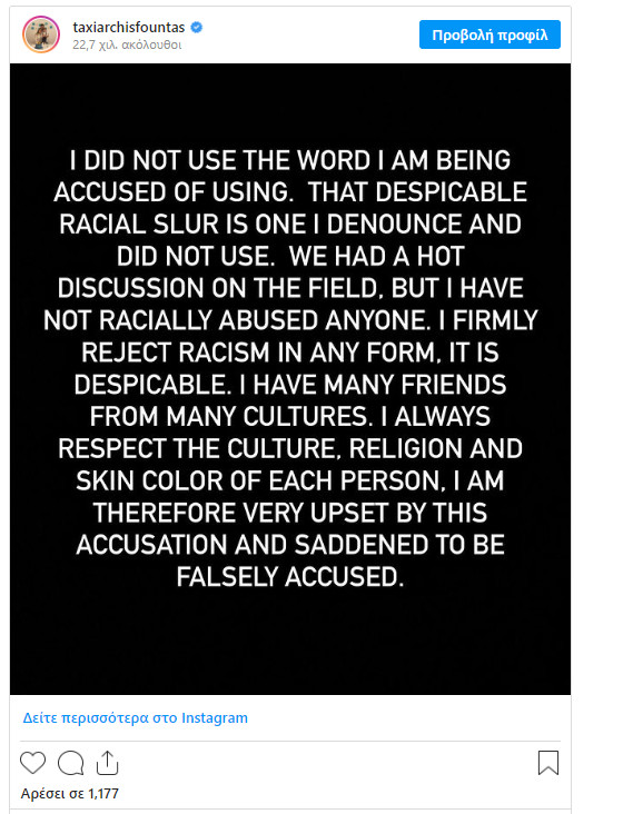 «Ειπώθηκαν πολλές κουβέντες στο Γήπεδο, αλλά δεν επιτέθηκα ρατσιστικά σε κανέναν» συμπλήρωσε και επισήμανε: «Απορρίπτω τον ρατσισμό σε κάθε μορφή του. Είναι απεχθής. Έχω πολλούς φίλους από πολλές κουλτούρες. Πάντα σέβομαι την κουλτούρα, τη θρησκεία και το χρώμα δέρματος κάθε ατόμου και γι’ αυτό είμαι πολύ αναστατωμένος από αυτήν την κατηγορία και λυπημένος που κατηγορήθηκα λανθασμένα».