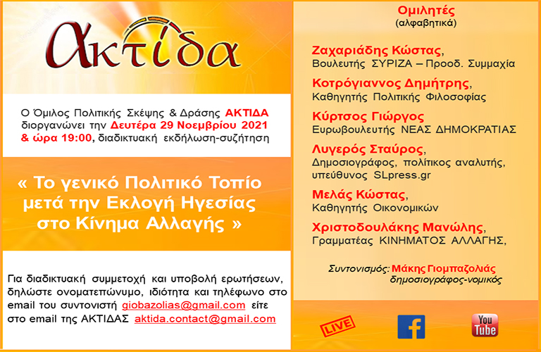 Με αυτά τα δεδομένα, η ΑΚΤΙΔΑ διοργανώνει διαδικτυακή εκδήλωση – συζήτηση, την Δευτέρα 29 Νοεμβρίου 2021, με θέμα :