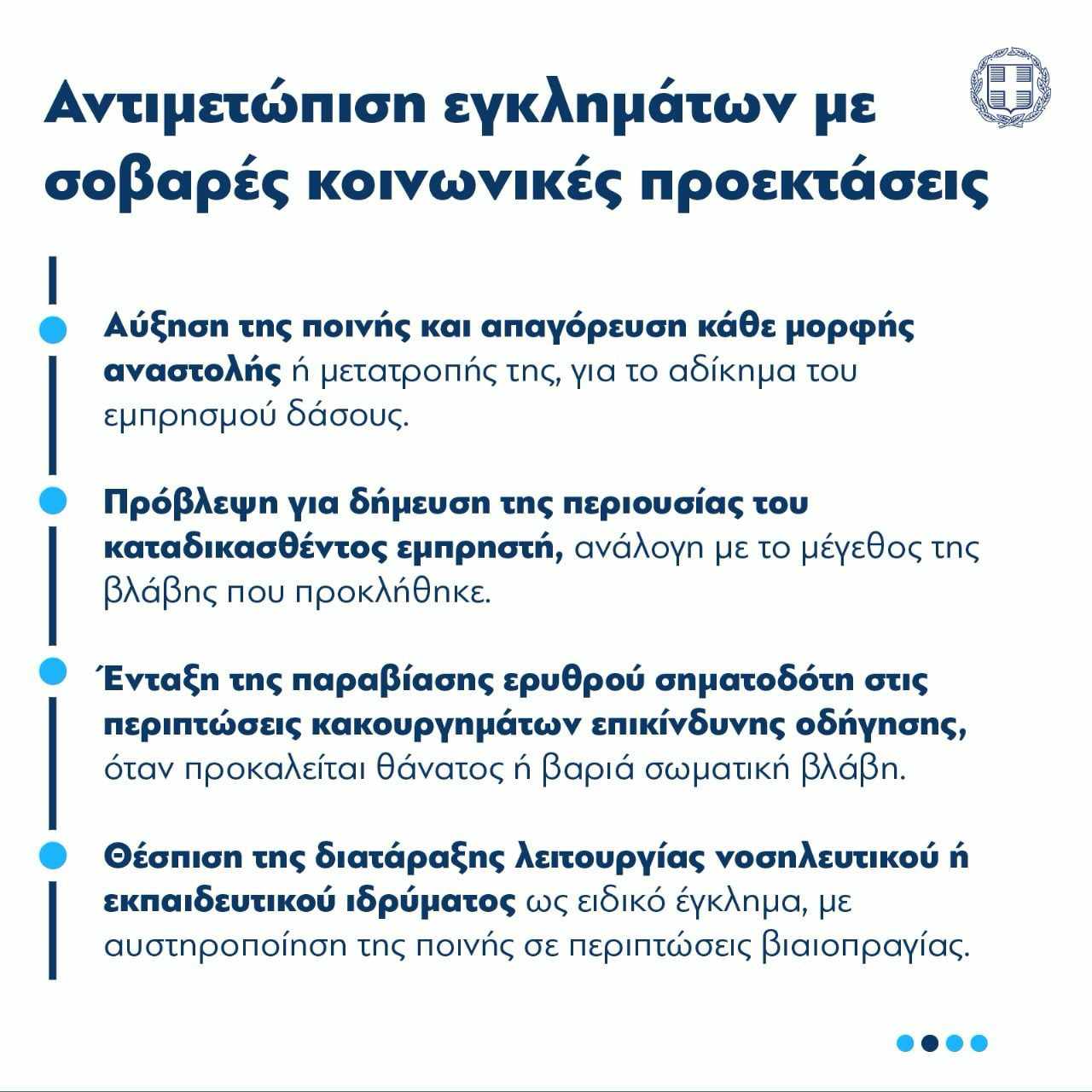 • Αύξηση της ποινής και απαγόρευση κάθε μορφής αναστολής ή μετατροπής της, για το αδίκημα του εμπρησμού δάσους.