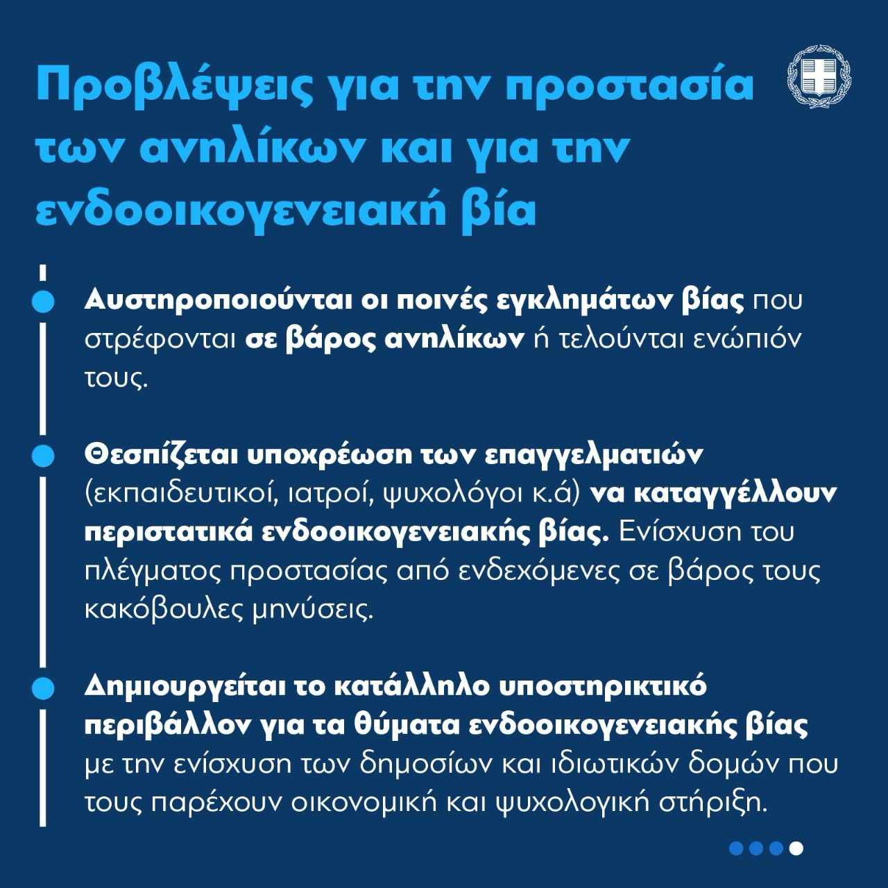 - Θεσπίζεται υποχρέωση των επαγγελματιών (εκπαιδευτικοί, ιατροί, ψυχολόγοι κ.ά) να καταγγέλλουν περιστατικά ενδοοικογενειακής βίας, με ταυτόχρονη ενίσχυση του πλέγματος προστασίας, από ενδεχόμενες σε βάρος τους κακόβουλες μηνύσεις.