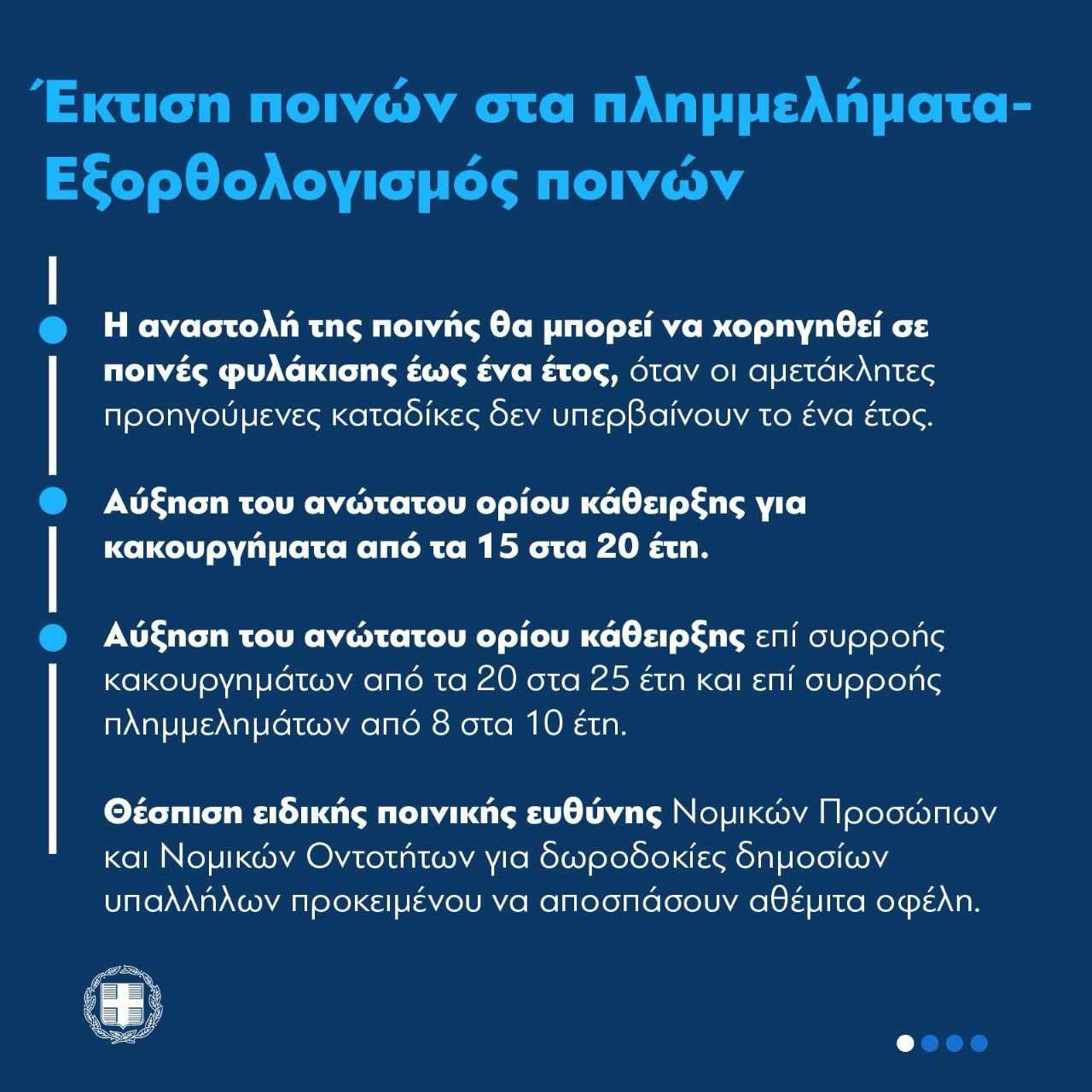 • Αύξηση του ανωτάτου ορίου κάθειρξης για κακουργήματα από τα 15 στα 20 έτη.