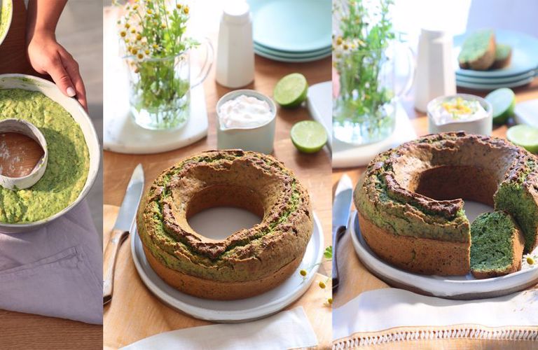 Προθερμαίνουμε τον φούρνο στους 180°C. Λαδώνουμε τη φόρμα του κέικ, αδειάζουμε το μείγμα, το στρώνουμε ομοιόμορφα και ψήνουμε για 1 ώρα και 10 λεπτά, μέχρι να φουσκώσει.