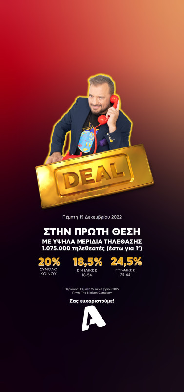 Το «Deal» τερμάτισε πρώτο με 18,5% στο δυναμικό κοινό, 20% στο σύνολο και 1.075.000 τηλεθεατές να το παρακολουθούν έστω για ένα λεπτό.