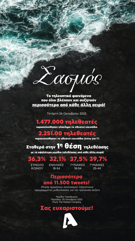 Σταθερά στην πρώτη θέση τηλεθέασης με τα υψηλότερα μερίδια από κάθε άλλη σειρά, ο «Σασμός» από τη συχνότητα του Alpha «τρέλανε» τα μηχανάκια της τηλεθέασης, σκαρφαλώνοντας στην κορυφή και κατακτώντας όλες τις κατηγορίες κοινού.