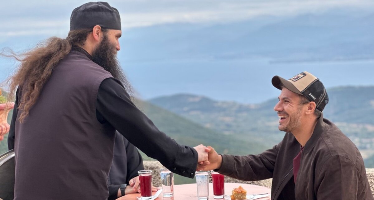 Εκεί, μαζί με τον πατέρα Ισαάκ και την ομάδα του, συμμετέχει στην προετοιμασία του γεύματος για τους μοναχούς: ρεβύθια με κριθαράκι και λαχανικά, μελιτζανοσαλάτα και ένα ξεχωριστό νηστίσιμο γαλακτομπούρεκο.