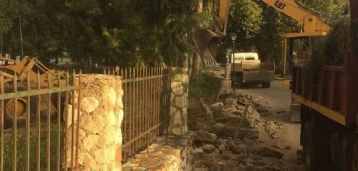 Σήμερα το πρωί ειδικά μηχανήματα κατεδαφίζουν την πέτρινη μάντρα του χώρου, ενώ θα ακολουθήσουν και οι υπόλοιπες προβλεπόμενες εργασίες σύμφωνα με τη μελέτη του συλλόγου Αρχιτεκτόνων που είχε εκπνηθεί για την περιοχή.