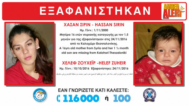 Πρόκειται για τη 16χρονη Χασάν Σιρίν (Hassan Sirin) και του Ζουχέιρ Χελέφ (Zuheir Helef) 1,5 μηνών που είναι πρόσφυγες από τη Συρία. Η ανήλικη μητέρα και το μωράκι της εξαφανίστηκαν από το κέντρο φιλοξενίας προσφύγων στο Καλοχώρι Θεσσαλονίκης.