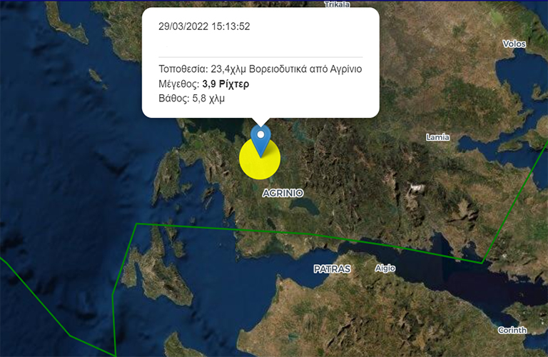 Σεισμική δόνηση 3,9 βαθμών της κλίμακας Ρίχτερ συνέβη στις 29 Μαρτίου 2022, στις 15:13:53, 27,7χλμ Βορειοδυτικά από το Αγρίνιο και σε εστιακό βάθος 5,0 χιλιομέτρων.