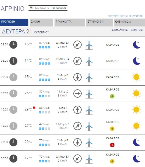 Τη Δευτέρα 21 Οκτωβρίου 2019 αναμένεται ηλιοφάνεια με αραιές μόνο νεφώσεις στα ορεινά ηπειρωτικά, στο Αιγαίο, στην Εύβοια, στην Ανατολική Στερεά Ελλάδα και στην Κρήτη.