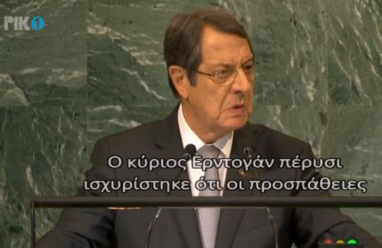 Σκληρή επίθεση κατά του Ρετζέπ Ταγίπ Ερντογάν έκανε ο Νίκος Αναστασιάδης από το βήμα της Γενικής Συνέλευσης του ΟΗΕ. Ο πρόεδρος της Κύπρου έψεξε τον Τούρκο ομόλογό του για τις επεκτατικές βλέψεις του και την επιθετική ρητορική του.