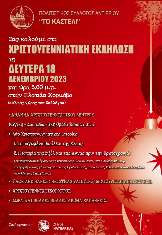 Ο Πολιτιστικός Σύλλογος Αντιρρίου «Το Καστέλι» σε συνδιοργάνωση με τον Δήμο Ναυπακτίας πραγματοποιούν Χριστουγεννιάτικη Εκδήλωση τη Δευτέρα, 18 Δεκεμβρίου 2023 και ώρα 5:00 μ.μ., στην Πλατεία Χορμόβα Αντιρρίου (Αύλειος χώρος Συλλόγου).
