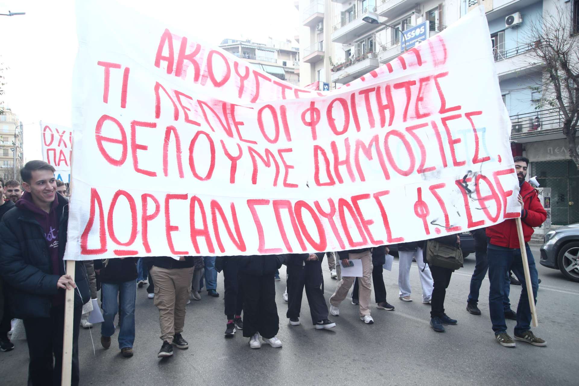 Δυναμική πορεία φοιτητών έγινε χθες το βράδυ και στην Θεσσαλονίκη. Υλικές ζημιές προκάλεσαν άγνωστοι στο κτίριο διοίκησης του Αριστοτελείου Πανεπιστημίου. Οι κουκουλοφόροι με ρόπαλα στα χέρια, άρχισαν να χτυπούν τα στόρια, προσπαθώντας να εισβάλλουν στο κτίριο της πρυτανείας με αποτέλεσμα να σπάσουν οι τζαμαρίες.