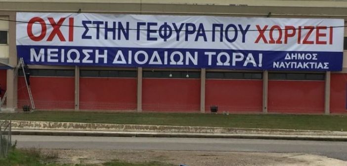 Τοποθέτησε νέο πανό ο Δήμος Ναυπακτίας στο κλειστό του Αντιρρίου. Στη θέση όπου υπήρχε το πανό που είχε τοποθετηθεί το περασμένο καλοκαίρι και το οποίο είχε σε μεγάλο μέρος του καταστραφεί καθώς όπως είχαμε αναφέρει τότε άγνωστοι είχαν προσπαθήσει να το κατεβάζουν κόβοντας το με αιχμηρό αντικείμενο, βέβαια μεγαλύτερη ζημιά έπαθε από τους ισχυρούς ανέμους του Δεκεμβρίου όπου τότε συνεργείο του Δήμου το είχε κατεβάσει. Αξίζει να αναφέρουμε πως η τοποθέτηση των πανό σε καίρια σημεία της Ναυπακτίας ήταν μια απόφαση που πάρθηκε ομόφωνα από το Δημοτικό συμβούλιο Ναυπακτίας για να χρησιμοποιηθεί ως «μοχλός» πίεσης κατά της τιμολογιακής πολιτικής της Γέφυρας.