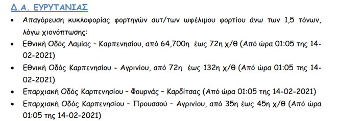 Αντιολισθητικές αλυσίδες στην Ε.Ο. Αγρινίου-Καρπενησίου και Ε.Ο. Αγρινίου-Προυσού