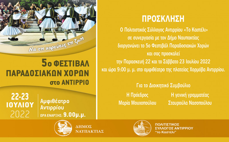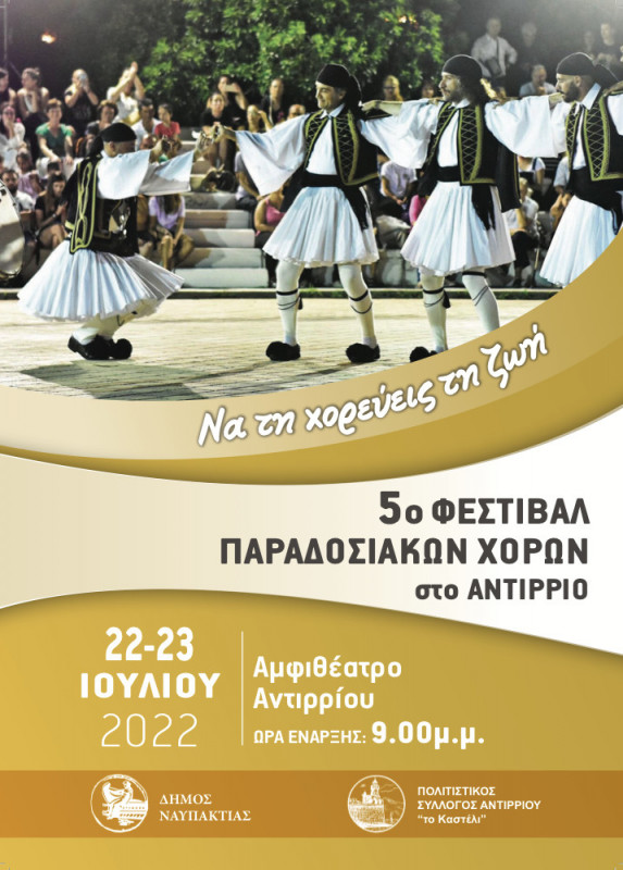 Ο Πολιτιστικός Σύλλογος Αντιρρίου «Το Καστέλι», σε συνεργασία με τον Δήμο Ναυπακτίας, διοργανώνει το 5ο Φεστιβάλ Παραδοσιακών Χορών την Παρασκευή, 22 και το Σάββατο, 23 Ιουλίου 2022 και ώρα 9:00 μ.μ. στο Αμφιθέατρο της Πλατείας Χορμόβα Αντιρρίου.