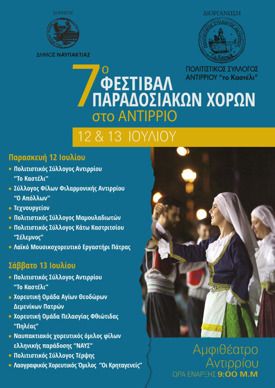 Ο Πολιτιστικός Σύλλογος Αντιρρίου «Το Καστέλι», σε συνεργασία με τον Δήμο Ναυπακτίας, διοργανώνουν το 7ο Φεστιβάλ Παραδοσιακών Χορών την Παρασκευή, 12 και το Σάββατο, 13 Ιουλίου 2024 και ώρα 21:00 μ.μ. στο αμφιθέατρο του Αντιρρίου (Πλατεία Χορμόβα).