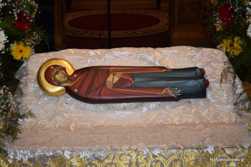 Την Τρίτη 13 Αυγούστου το βράδυ, στον Άγιο Νικόλαο Αντιρρίου οι Ιεροψάλτες, οι Ιερής και οι πιστοί έψαλαν τα Εγκώμια της Παναγίας στον Επιτάφιό της και στη συνέχεια πραγματοποιήθηκε η περιφορά του επιταφίου της χοροστατούντος του Μητροπολίτη Ναυπάκτου και Αγίου Βλασίου κ.κ. Ιερόθεου.