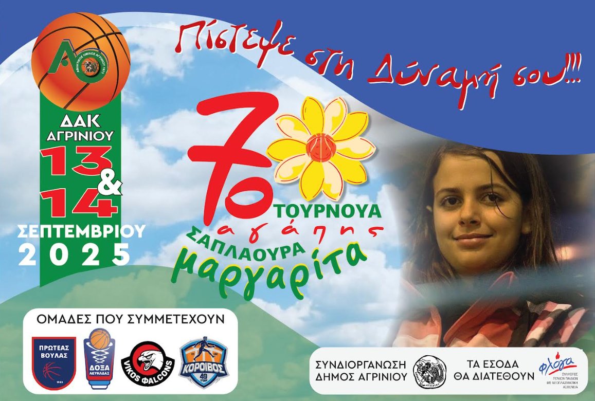 Ο Α.Ο. Αγρινίου γνωστοποιεί πως 13-14/09 θα πραγματοποιηθεί το Τουρνουά «Μαργαρίτα Σαπλαούρα» για 7η συνεχόμενη χρονιά στο Δ.Α.Κ.