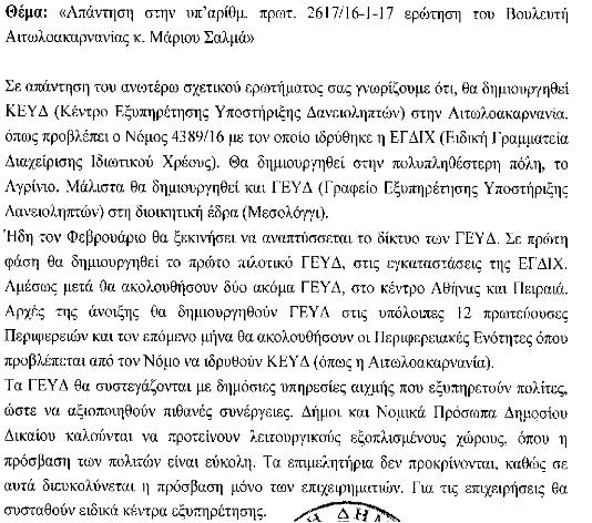 Απάντηση Παπαδημητρίου σε Σαλμά για τη Κέντρων Υποστήριξης Δανειοληπτών στην Αιτωλ/νία